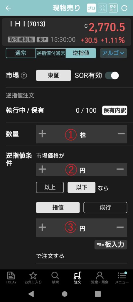 - 「現物売」画面で「逆指値」を選択する。