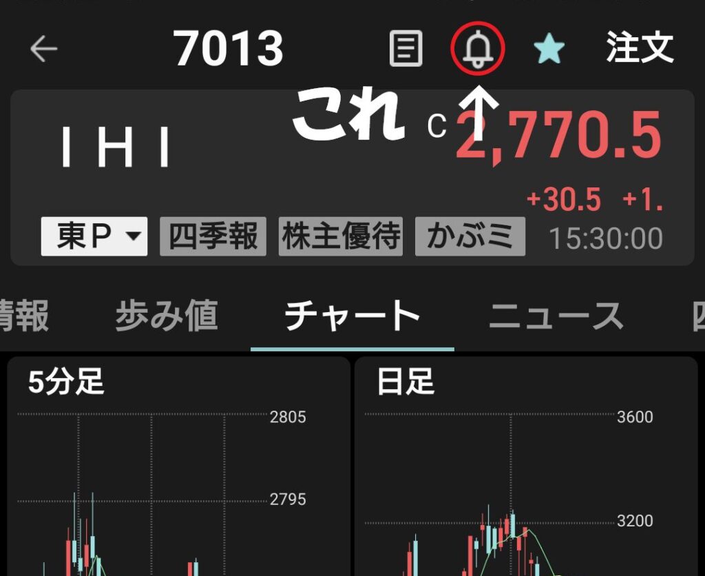 iSPEEDの銘柄詳細画面から「アラート設定」をタップし、すぐに価格を入力する。 - 緊急時の行動