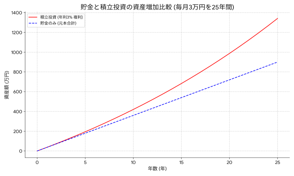 例えば、毎月3万円を25年間貯金した場合、元金は900万円です。