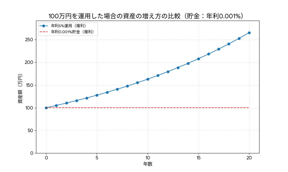 項目年利5%運用(複利)年利0.001%貯金(複利)